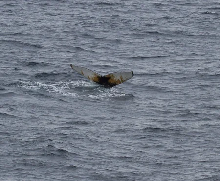 The intercom went off at about 6:30 this morning, a call from the captain to tell us that a school of humpback whales were swimming and feeding around the ship and so we tumbled into our clothes and up to the 6'th level deck where there is an Observation lounge area surrounded on three sides by floor to ceiling windows and access to the open deck. Wind was chill and the temperature about 3 or 4C, frigid. Whales would spout and rise to the surface, breathe and sink back into the water, 1 or 2 at a time and about 200 or 300 metres off the side of the ship. They would rise and sink unpredictably so it was hard to know where they would come up and since they spent only seconds above the surface of the water, it was hard to know where to point the camera. When one was spotted by the time they were located in the viewfinder, they were gone.