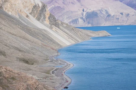 Ymer Island, highland plateau looking down on the beach below. Tiny red dots are fellow passengers walking on the beach