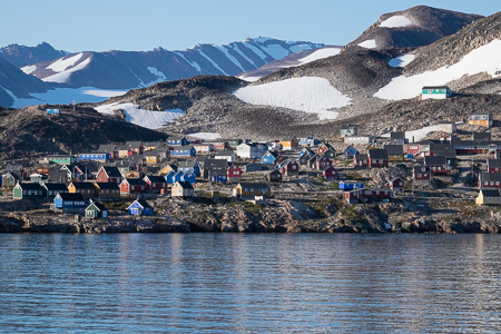 A very pretty little community, small wooden houses brightly painted in blues, greens and reds perched on the edge of the fjord and at the foot of the ever-present snow-capped mountains. We are a rare sight for the inhabitants since the town is supplied by only 2 supply ships a year, one in June at the beginning of the short summer and one in September at the beginning of winter. Apart from that 2 or 3 small expedition ships, much like ours, stop off over the summer and sometimes leave them some food supplies. Everything that a town needs, from food to furniture and from fuel to vehicles to clothing and appliances comes in on these two supply boats and when something runs out they do without it until the next boat.