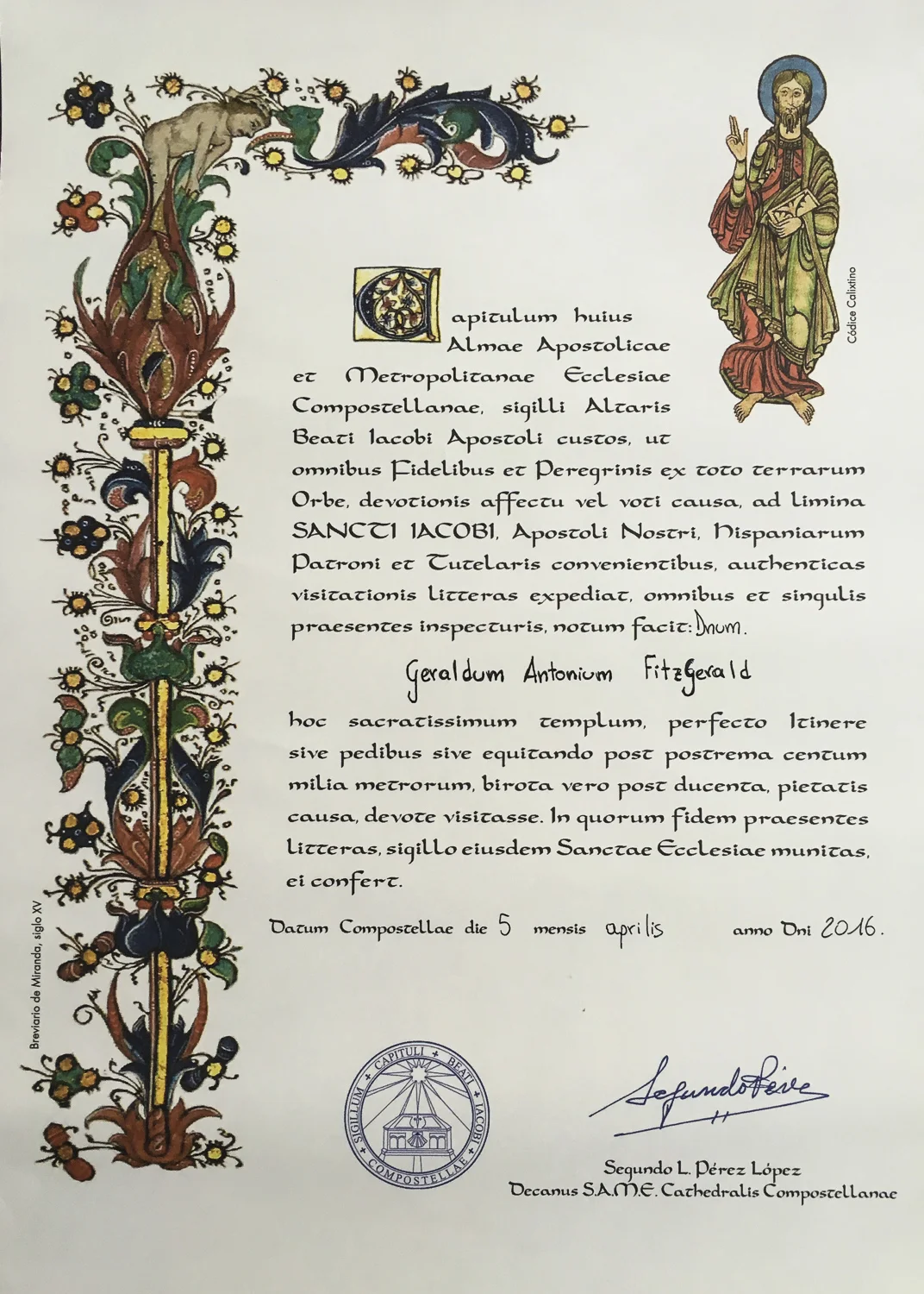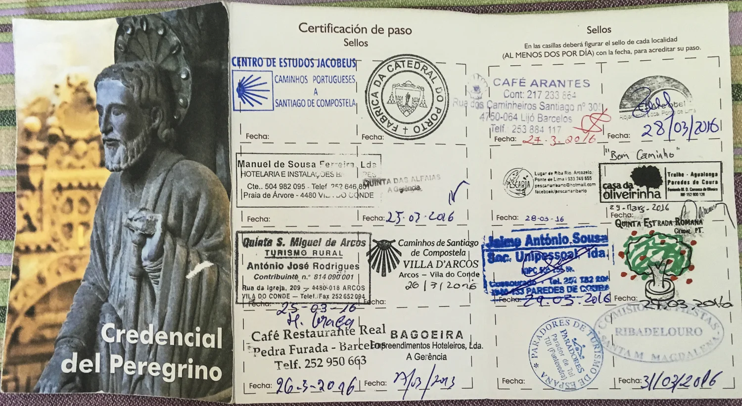 What's the Compostela? The Cathedral of St James in Santiago has for a very long time issued a document written in Latin that states that the person named therein has come out of a pious motivation to the Cathedral in Santiago to revere the remains of St. James. That’s essentially its entirety. In order to receive your Compostela you must get a pilgrim's passport from the cathedral or other issuing source at the beginning of your Camino and you must have it stamped in each town or church that you pass through along your way. In reality you try and get two stamps in your passport each day from cafes, restaurants, churches or hotels as you go. The places that stamp your passport are usually pretty good about making sure that they enter the date that they stamped it and they usually sign the stamp as well. The Pilgrim office checks passports to see if they are properly stamped to validate that the owner has done the Camino and has in fact been on the road during the time that you state on your form.